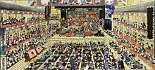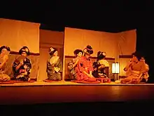 Le kabuki est fortement marqué par la culture bourgeoise des chōnin de l’époque d’Edo, et ce n’est qu’après plusieurs décennies après son apparition que le genre, issu des quartiers de plaisir, prend sa forme définitive, à la fois drame et grand spectacle[197]. Comme le nô ou le bunraku, un programme traditionnel de kabuki comprend plusieurs pièces jouées sur une journée.