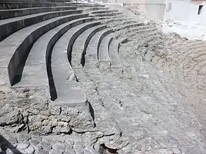 Tous les gradins supérieurs et du milieu étaient recouverts d'un enduit de chaux et de céramique écrasée, la zone la plus proche de l'orchestre était quant à elle recouverte de pierres.