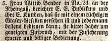 Sara Bender, qui avait le sens des affaires, poursuivit l’exploitation de la verrerie de son défunt mari, grâce à une autorisation particulière. En , elle épousa le maître verrier Adam Uehlinger, dont elle eut deux autres enfants. Elle décéda le , à l’âge de 55 ans, laissant une fortune considérable de presque 20'000 francs.