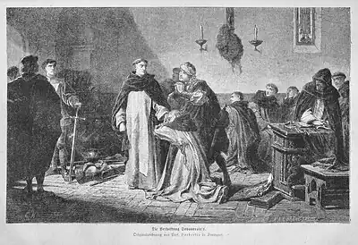 Savonarole a perdu toute crédibilité depuis qu'il a refusé de se soumettre à une disputatio que réclamaient ses partisans pour lui permettre de prouver sa bonne foi. En , il est mis en prison et soumis à l'autorité inquisitoriale pendant 50 jours, un représentant spécial étant venu de Rome.