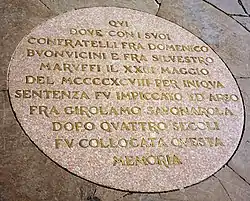- Il est écrit en italien : En cet endroit où, avec ses frères en religion fra Domenico Buonvicini et fra Silvestro Maruffi, le 23 mai 1498 à la suite d'une condamnation inique, fut pendu et brûlé fra Girolamo Savonarola, cette plaque à sa mémoire a été posée après quatre siècles.
