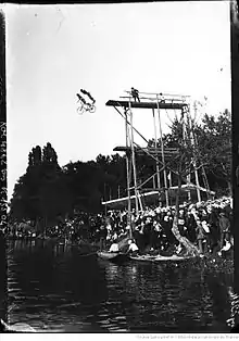 - Saut de la mort depuis l’Île aux Cygnes à Paris le 4 août 1912, photographie de presse de l’Agence Rol sur Gallica.