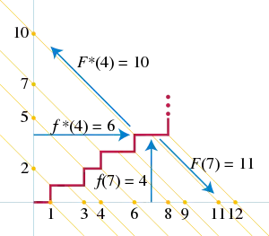Cela revient à définir comme le nombre d'entiers pour lesquels ; il en résulte que [2]. Les représentations de et comme des histogrammes sont symétriques l'une de l'autre par rapport à la première bissectrice [3].