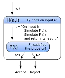 - Si l'algorithme représenté par a s'arrête pour une donnée i, alors, Ft = Fb. Parce que P(b) = "oui" et le résultat de P(x) dépend seulement de Fx, cela implique que P(t) = "oui" et donc que H(a, i) = "oui".