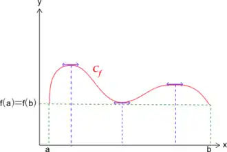 Les hypothèses nous garantissent par le théorème des bornes que la fonction a un minimum et un maximum. Il y a donc bien (au moins) un point c entre a et b tel que f(c) soit un maximum ou un minimum. En un tel point, la tangente à la courbe est horizontale.