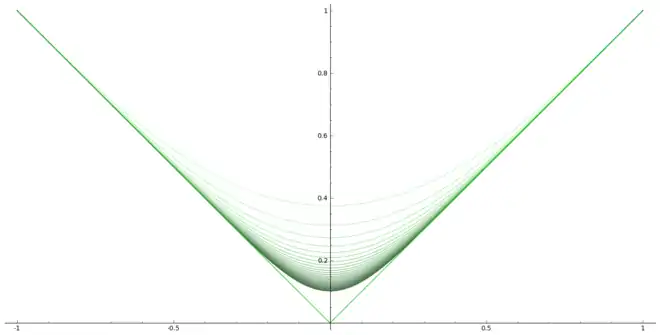 Ci-dessous, un exemple d'une suite de polynômes convergeant vers la fonction valeur absolue sur l'intervalle [–1, 1].