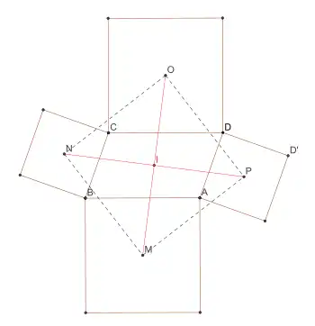 Problème de Thébault n°1 — Soit un parallélogramme ABCD, quelconque, et extérieurement, quatre carrés construits sur les côtés du parallélogramme. Si M, N, O et P désignent les centres de ces carrés placés comme sur la figure, alors MNOP est également un carré.