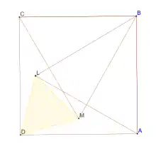 Problème de Thébault n°2 — Soit un carré ABCD. Construisons deux triangles équilatéraux sur deux côtés consécutifs du carré, tous les deux "intérieurs" ou "extérieurs" par exemple ABL et BCM. Alors le triangle LMD est équilatéral.