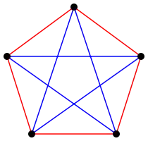 La conclusion du théorème ne tient pas si l'on remplace la fête de six personnes par une fête de moins de six. Pour l'illustrer, nous donner une coloration de avec le rouge et le bleu qui ne contient pas de triangle avec toutes les arêtes de la même couleur. Nous dessinons sous la forme d'un pentagone entourant une étoile (un pentagramme). Nous colorions les arêtes du pentagone en rouge et les arêtes de l'étoile en bleu. Ainsi, 6 est le plus petit nombre pour lequel nous pouvons prétendre appliquer le théorème. Dans la théorie de Ramsey, nous écrivons ce fait par :