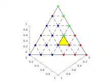 Cette coloration vérfie les hypothèses du lemme de Sperner: chaque sommet de est d'une couleur différente (), si un des sommets de la subdivision est dans l'enveloppe convexe de sommets de alors .