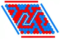 Le jeu a lieu sur un plateau composé d'hexagones. À la fin du jeu, certains hexagones sont recouverts par des jetons (rouges ou bleus sur la figure de gauche). Le camp des bleus est formé par les deux côtés du plateau signalés par une ligne bleue, les deux autres côtés (signalés par une ligne rouge) constituent le camp adverse. S'il est possible de tracer une ligne blanche qui ne quitte jamais la zone des hexagones bleus et qui relie les deux côtés bleus, les bleus ont gagné, comme illustré sur la figure de gauche. De même, s'il est possible de tracer une ligne blanche qui ne quitte jamais la zone des hexagones rouges et qui relie les deux côtés rouges, les rouges ont gagné. L'article Hex montre que si le plateau est rempli de jetons, le match nul est impossible, c'est-à-dire que, soit les hexagones rouges, soit les bleus, sont support d'une ligne blanche reliant les deux côtés d'un même camp. Cette propriété permet de démontrer le théorème de Brouwer.