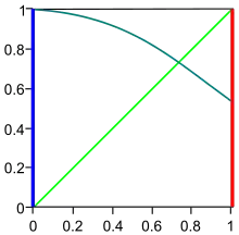 En dimension un, le résultat est à la fois intuitif et aisé à démontrer. On note le domaine de définition de . La fonction est continue et à valeurs dans le même segment. Dire que cette fonction admet un point fixe, revient à dire que son graphe (en bleu-gris sur la figure de droite et choisi dans ce cas égal à celui de la fonction cosinus sur l'intervalle ) croise celui de la fonction définie sur , qui à associe (en vert sur la figure de droite).