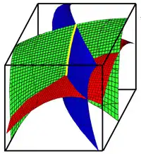 La première coordonnée est positive sur la face gauche du cube et négative sur la face droite. « Il y a tout lieu de penser que » la zone des zéros contient une « nappe », illustrée en bleu sur la figure de droite. Cette « nappe » couperait le cube en au moins deux composantes connexes, l'une contenant une portion de la face de droite l'autre celle de gauche. Si l'axe des y décrit la direction « devant-derrière » le même « raisonnement » « laisse penser à » l'existence d'une « nappe », en vert sur la figure, qui couperait encore en au moins deux composantes connexes le cube. L'intersection des deux « nappes » contiendrait « probablement » une « ligne », en jaune sur la figure, partant de la face du haut pour rejoindre celle du bas. La troisième composante de g décrirait, cette fois-ci, une « nappe » en rouge sur la figure. Cette « nappe » « semble » croiser « nécessairement » la ligne jaune. Ce point d'intersection serait un point fixe recherché.