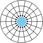 Étant donné que l'on suppose que certaines si ce n'est toutes les particules gravifiques convergeant vers un objet sont soit absorbées soit ralenties par l'objet, l'intensité du flux de particules gravitiques émanant de la direction d'un objet massif est moindre que celle du flux convergeant vers l'objet. On peut imaginer ce déséquilibre de flux de moment, et par conséquent de la force exercée par quelque autre corps dans le voisinage, comme étant distribué sur une surface sphérique centrée sur l'objet (illustration P4). Le déséquilibre de flux de moment sur une surface entièrement sphérique entourant l'objet est indépendante de la sphère encerclante, alors que la surface de la sphère augmente comme le carré du rayon. Par conséquent, le déséquilibre de moment par unité de surface diminue comme l'inverse du carré de la distance.