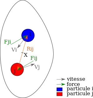 Pour cette approche, nous allons modéliser la contribution d’une liaison entre deux molécules à la puissance des efforts intérieurs. On considère une liaison entre deux molécules, i et j, centrée au point . On note l'effort de i sur j, et la vitesse virtuelle de la particule i. On pose