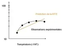 D'autres expériences ont montré que l’effet de la température ne pouvait pas être décrit correctement par l’équation d’Arrhénius[13]. Par exemple, le taux d’ingestion des proies par un prédateur, en utilisant une échelle logarithmique, ne suit pas de relation linéaire avec la température, et diminue à des températures trop élevées. La loi d’Arrhénius utilisée par la MTE n’est donc valable que pour des gammes de températures réduites et ne permet pas d’avoir un modèle général[14].