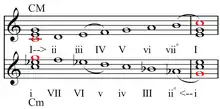 - La transformation N (pour Nebenverwandt) échange un accord majeur par sa sous-dominante mineure ou un accord mineur par sa dominante majeure (exemple : do majeur devient fa mineur et inversement). Cette transformation peut être obtenue en appliquant les transformations R, L puis P.