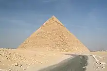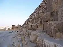- les blocs du parement extérieur (disparus sur Khéops : seuls quelques-uns sont encore en place sur la première assise, mais ces blocs de parement lisse issus d'une carrière souterraine de Tourah sont bien visibles au sommet de Khéphren ou sur Dahchour-Sud/Rhomboïdale) ;