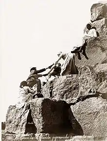 Le géographe grec Strabon voyagea en Égypte en -25 ou -24. Dans sa Géographie (XVII, 1,33-34), il évoque seulement, tenant lieu de porte dans le parement extérieur de la grande pyramide, une « pierre qui peut s'enlever (λίθον ἐξαιρέσιμον[53]) et qui, une fois enlevée, laisse voir l'entrée d'une galerie tortueuse ou syringe, aboutissant au tombeau »[54] ; il mentionne également le revêtement de granite, jusqu'à mi-hauteur, de la pyramide de Mykérinos et enfin la présence de « lentilles » (nummulites) sur tout le plateau. Il ne dit rien des méthodes de construction des pyramides[54].