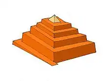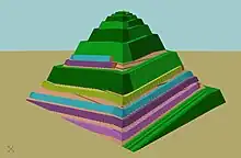 - une enveloppe de la même matière (calcaire nummulitique), constituant les gradins fort bien taillés et parfaitement réglés (mais de hauteur variable) visibles de nos jours sur l'ensemble des faces de la pyramide, d'une masse de l'ordre de 2 à 2,5 tonnes ;