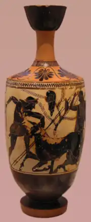 - Thésée tue le Minotaure, peinture noire, vase grec du Ve siècle av. J.-C. Musée du Louvre Paris