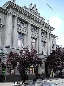 Le bâtiment actuel a été construit en 1911 par l'architecte Beketov en style néoclassique avec quelques éléments Art nouveau. Le fronton et le portique sont décorés de sculptures d'Apollon musagète, Melpomène, de bustes, de lions et de griffons, etc.