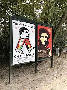 Même s’il y a eu des exceptions notables, comme Jacques Richez, Roland Topor ou Raymond Renard, l’identité graphique du théâtre de Poche est signée Olivier Wiame, scénographe et illustrateur, qui réalise les affiches du théâtre depuis le milieu des années 80[120]. Soucieux d’interpeller « le passant dans la rue »[51], son travail d’affichiste est à la fois érudit (par son approche dramaturgique des œuvres) et direct (par sa puissance sémantique). Regrettant que le monde de l’affiche soit laissé aux seuls publicitaires, Olivier Wiame revendique par son travail graphique un engagement qui concerne également l’espace public et, dans cette volonté de réappropriation, crée des images au « ton volontiers incisif »[51] pour inviter les passants à penser[121].