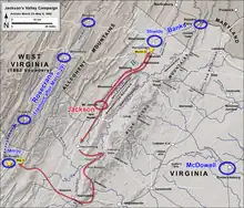 Après Kernstown, l'Union réorganisa ses forces : le commandement de McDowell devint le Département de la Rappahannock ; le corps de Banks devint le département de la Shenandoah, tandis que l'ouest de la Virginie (aujourd'hui Virginie-Occidentale) devint le Mountain Department confié au major-général John C. Frémont. Les trois commandements, qui rapportaient directement à Washington, reçurent l'ordre d'anéantir les forces de Jackson, qui menaçaient la capitale fédérale. Dans le même temps, les autorités confédérées détachèrent la division commandée par Richard S. Ewell de l'armée de Johnston et l'envoyèrent en renfort dans la vallée. Avec ces 17 000 hommes supplémentaires, Jackson décida d'attaquer les forces de l'Union avant qu'elles ne se rejoignent pour le défaire. Il se concentra tout d'abord sur la colonne du Mountain Department commandée par Robert Milroy mais, alors qu'il empruntait un chemin détourné pour masquer ses intentions, il fut attaqué par Milroy et dut livrer, le , la bataille de McDowell au cours de laquelle, après un combat très dur, il parvint à repousser les troupes de l'Union. Banks envoya une de ses divisions renforcer McDowell à Fredericksburg, conservant un effectif de 8 000 hommes qu'il déplaça vers une position plus forte à Strasburg (Virginie)[12].