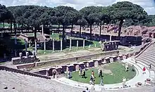 Vitruve conseille d'aménager à l'arrière du mur de scène un portique (porticus post scaenam) accessible aux spectateurs en traversant les basiliques, qui sert de promenoir ou d'éventuel abri lors d'averse interrompant la représentation[39]. Cet aménagement, facultatif, peut consister en une colonnade unique, ou de façon plus importante offrir un espace vert entouré de colonnes (quadriporticus). Si les premiers quadriportiques construits par les Romains ne sont plus que des vestiges enfouis, comme celui du théâtre de Pompée à Rome, d'autres exemples subsistent dans toute leur étendue sur les sites archéologiques, comme la Place des Corporations à Ostie et derrière le théâtre de Pompéi[40].