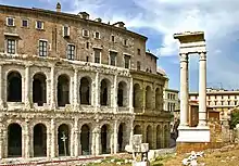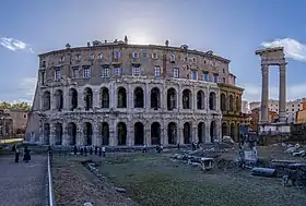 Le théâtre de Pompée bâti en 55 av. J.-C. est suivi une génération plus tard par le théâtre de Marcellus, commencé par Jules César sur le site du theatrum ad Apollinis où se dressaient les édifices en bois des jeux apollinaires et terminé par Auguste. Plus petit que le théâtre de Pompée (129,50 m de diamètre extérieur, environ 32,60 m de hauteur), il est inauguré en 13 ou Il définit le modèle canonique du théâtre romain avec sa cavea appuyée sur des voûtes radiales, ses trois étages de gradins, ses galeries intérieures de circulation, son mur de scène flanqué de deux grandes salles et sa façade d'arcades en grand appareil décorées de colonnes engagées[8].