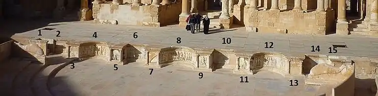Le bord de la scène qui fait face à l'orchestre, ou pulpitum, est constitué d'un petit mur divisé en niches semi-circulaires ou rectangulaires, et est luxueusement décoré de bas-reliefs en marbre. Plusieurs théâtres ont livré des fragments assez importants de leur pulpitum, montrant la diversité des décors :