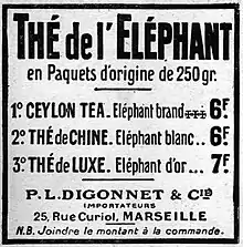 En 1892, les deux frères Pétrus et Lazare Digonnet * ( * 1864 - 1944 ) créent leur entreprise d'importation et de vente de thé sous le nom de Maison P.L. Digonnet et Cie puis Établissements Lazare Digonnet. Celle-ci se renomme Société des Thés de l’Éléphant à partir de 1927, située au 97, boulevard Camille Flammarion à Marseille, après avoir pris le contrôle de Maison Ranque & Lambert, de la Compagnie de l’Indochine, et de la Maison Lewis J. Smith.