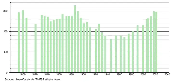 L'évolution du nombre d'habitants est connue à travers les recensements de la population effectués dans la commune depuis 1793. Pour les communes de moins de 10 000 habitants, une enquête de recensement portant sur toute la population est réalisée tous les cinq ans, les populations légales des années intermédiaires étant quant à elles estimées par interpolation ou extrapolation[17]. Pour la commune, le premier recensement exhaustif entrant dans le cadre du nouveau dispositif a été réalisé en 2007[18].