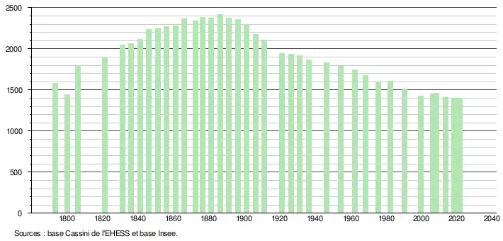 L'évolution du nombre d'habitants est connue à travers les recensements de la population effectués dans la commune depuis 1793. Pour les communes de moins de 10 000 habitants, une enquête de recensement portant sur toute la population est réalisée tous les cinq ans, les populations légales des années intermédiaires étant quant à elles estimées par interpolation ou extrapolation[27]. Pour la commune, le premier recensement exhaustif entrant dans le cadre du nouveau dispositif a été réalisé en 2008[28].