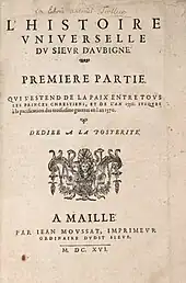 Théodore Agrippa d'Aubigné, né d’Aubigny[n 1] le au château de Saint-Maury près de Pons, et mort le à Genève, est un homme de guerre, écrivain controversiste et poète baroque français. Il est notamment connu pour Les Tragiques, poème héroïque racontant les persécutions subies par les protestants.
