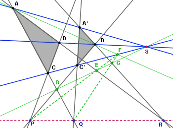 Les deux triangles ABC et A'B'C' sont en perspective depuis le point S, et leurs côtés homologues s'intersectent en