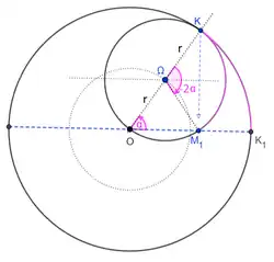 Si est un point de contact ultérieur tel que , le point de contact s'est déplacé d'un arc de longueur sur . Le point s'est alors déplacé d'un arc de même longueur sur le cercle mobile en sens inverse, donc .