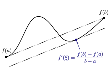 Pour toute fonction réelle d'une variable réelle f : [a, b] → ℝ (a et b réels tels que a < b), supposée continue sur l'intervalle fermé [a, b] et dérivable sur l'intervalle ouvert ]a, b[, il existe un réel c dans ]a, b[ vérifiant :