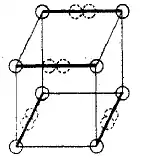 Les liaisons triples ne peuvent pas être prises en compte dans le modèle d'atome cubique, car il n'existe aucun moyen de partager 6 sommets entre deux cubes. G. Lewis suggéra que les paires d'électrons dans les liaisons atomiques montraient une attraction spécifique, qui pouvait résulter en une structure tétraédrique, comme indiqué dans la figure ci-dessous (la nouvelle localisation des électrons est représentée par les cercles pointillés au milieu des arêtes en gras). Cela permet la formation d'une liaison simple par partage d'un sommet, une liaison double par partage d'une arête, et la triple en partageant une face. Cette hypothèse prend aussi en compte les rotations libres autour des liaisons simples et pour la géométrie tétraédrique du méthane. On peut dire de manière surprenante qu'il existe un soupçon de vérité dans cette idée, car il fut montré plus tard que le principe d'exclusion de Pauli induit un « trou de Fermi » de répulsion décroissante entre une paire d'électrons de spins opposés dans la même orbitale.