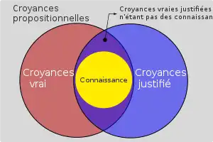 L'approche classique définit la connaissance comme une croyance vraie et justifiée. C'est ainsi qu'à la fin du Ménon Platon propose de définit la connaissance ainsi (il conteste cependant cette idée dans le Théétète)[Notes 4]. Cette définition exclut les cas où un individu a une croyance vraie, mais où il n'est pas en mesure d'expliquer pourquoi cette croyance est vraie. L'individu peut ainsi croire que la terre tourne autour du soleil (proposition p) par exemple par ouï dire, sans être capable de l'expliquer. La proposition p est vraie, mais l'individu n'a pas la connaissance que la terre tourne autour du soleil. Il s'agit pour l'individu d'une croyance.