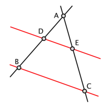 - En France et dans d'autres pays (comme l'Italie), le « théorème de Thalès » désigne un autre théorème, sur les rapports de longueurs dans un triangle coupé par une droite parallèle à l'un des côtés, ou une généralisation de ce résultat[40]. Le théorème, formulé dans un triangle quelconque, apparait effectivement, trois siècles après Thalès, dans le Livre VI (proposition 2) des Éléments d'Euclide. Sa démonstration repose alors sur la proportionnalité d'aires de triangles de même hauteur.