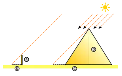 La seconde dénomination renvoie à la mesure de la hauteur des pyramides d'Égypte par la mesure de leur ombre. Elle est rapportée par Pline l'Ancien, Plutarque et Diogène Laërce[45]. Pour Pline et pour Diogène Laërce, Thalès attend que son ombre soit égale à sa taille pour mesurer l'ombre de la pyramide[45]. Il en déduit alors de manière empirique donc, et non théorique, qu'il doit en être de même pour la pyramide[46]. Diogène Laërce écrit au IIIe siècle mais cite sa source, Hieronymus de Rhodes un disciple d'Aristote, qui est probablement également celle de Pline[45].
