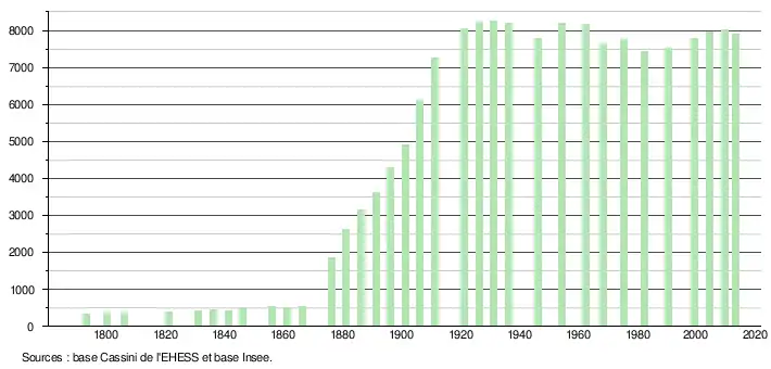 - Par convention dans Wikipédia, le principe a été retenu de n’afficher dans le tableau des recensements et le graphique, pour les populations légales postérieures à 1999, que les populations correspondant à une enquête exhaustive de recensement pour les communes de moins de 10 000 habitants, et que les populations des années 2006, 2011, 2016, etc. pour les communes de plus de 10 000 habitants, ainsi que la dernière population légale publiée par l’Insee pour l'ensemble des communes.