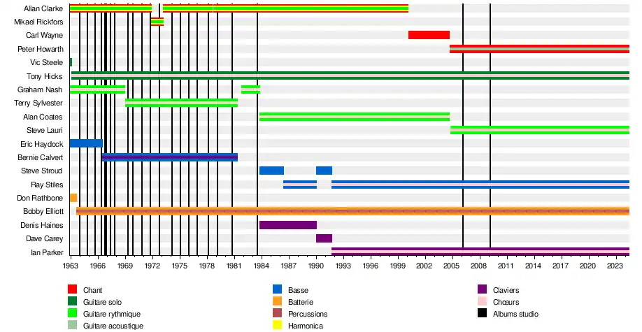 - Allan Clarke — chant, harmonica, guitare rythmique (1962-1971, 1973-1999)