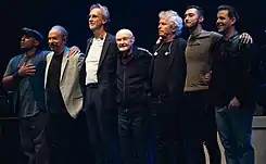 Les sept musiciens réunis au centre de la scène dont Tony Banks au piano, Daryl Stuermer à la guitare acoustique et Mike Rutherford à la basse (instruments inversés sur Follow You Follow Me)