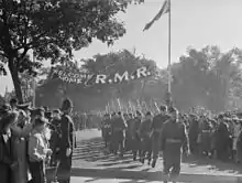 Les soldats du Royal Montreal Regiment défilent dans les rues de Montréal, à leur retour du front, à la fin de la Seconde Guerre mondiale, 22 septembre 1945