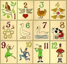 The Twelve Days of Christmas (Les Douze Jours de Noël) est un chant de Noël très connu dans les pays anglophones. Il s’agit d’une comptine à récapitulation où sont énumérés douze cadeaux qu’une personne dit avoir reçus de son amoureux/se durant les douze jours consécutifs du temps de Noël. Après l’annonce d’un nouveau cadeau, la liste des précédents est répétée à l’envers. Les cadeaux sont, dans l’ordre : une perdrix dans un poirier, deux colombes, trois poules françaises, quatre merles noirs, cinq anneaux d’or, six oies pondant, sept cygnes nageant, huit filles de ferme trayant, neuf dames dansant, dix messieurs sautant, onze joueurs de fifre jouant, douze tambours battant. Les cartes de Noël avec une perdrix dans un poirier sont une illustration du premier cadeau : « A partridge in a pear tree ».