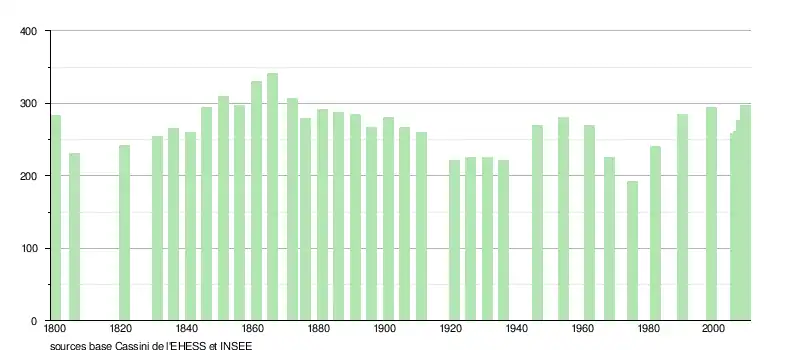 L'évolution du nombre d'habitants est connue à travers les recensements de la population effectués dans la commune depuis 1793. Pour les communes de moins de 10 000 habitants, une enquête de recensement portant sur toute la population est réalisée tous les cinq ans, les populations légales des années intermédiaires étant quant à elles estimées par interpolation ou extrapolation[24]. Pour la commune, le premier recensement exhaustif entrant dans le cadre du nouveau dispositif a été réalisé en 2005[25].