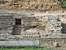 Découverts dès 1842, et fouillés à partir de 1966 dans le cadre un chantier d'étude des vestiges de la cathédrale paléochrétienne, qui révèle l'implantation de celle-ci sur les substructions des thermes, arasées à 25 cm environ pour servir de fondation à la cathédrale[4]. Ces thermes sont ceux dont l'organisation est la mieux restituée. Ils étaient bâtis sur une terrasse artificielle surplombant le cours canalisé du Valvachère. Cette terrasse mesure 74 mètres de long sur environ 30 mètres de large. Un portique large de 3,45 mètres constituait la façade des thermes longeant le Valvachère. Derrière ce portique, trois ailes distribuées en U autour d'une cour peuvent être restituées : la grande salle au nord est large de 11,25 mètres et ne possède pas de murs intermédiaires, ce qui en fait un gymnase. Son sol est constitué d'un béton de tuileau. L'aile ouest est divisée en quatre pièces dont trois sont sur hypocauste (système de chauffage). Le quatrième, la plus au nord, à l'angle nord-ouest, sert d'articulation entre le gymnase et les trois pièces chauffées. C'est la pièce froide, le frigidarium. Ce frigidarium abrite un baptistère paléochrétien du Ve siècle[5]. Ses fortes maçonneries suggèrent qu'il s'agissait d'une pièce voûtée. À son extrémité ouest se trouve une piscine. Les trois autres pièces constituent la partie chauffée des thermes et sont à interpréter comme étant le laconicum (l'étuve), auquel on accède via le tepidarium précédé de l'apodyterium (vestiaire et salle d'entrée du complexe thermal). L'aile n'est que partiellement fouillée, ce qui ne permet pas de restituer ses fonctions. Seul le départ de deux salles est découvert[6].