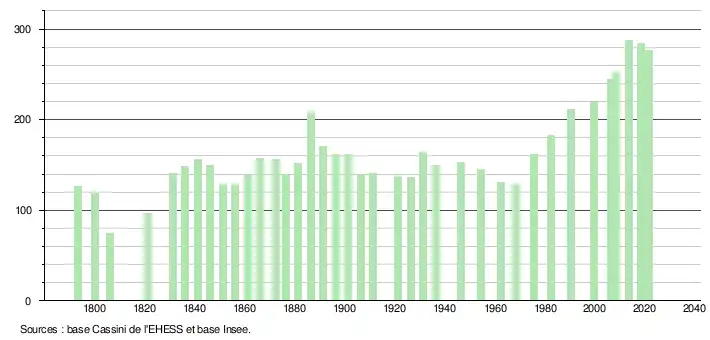 L'évolution du nombre d'habitants est connue à travers les recensements de la population effectués dans la commune depuis 1793. Pour les communes de moins de 10 000 habitants, une enquête de recensement portant sur toute la population est réalisée tous les cinq ans, les populations légales des années intermédiaires étant quant à elles estimées par interpolation ou extrapolation[18]. Pour la commune, le premier recensement exhaustif entrant dans le cadre du nouveau dispositif a été réalisé en 2008[19].